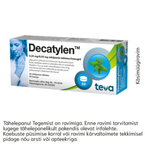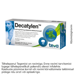 Decatylen™ 0,25 mg/0,03 mg losengid N40 Toimeaine:Dekvaliinkloriid/tsinhokaiinvesinikkloriid Käsimüügiravim:Decatylen (dekvaliinkloriid/tsinhokaiinvesinikkloriid)