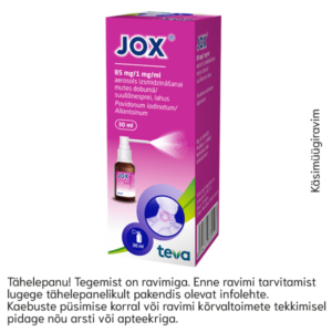 JOX Suuõõnesprei 8,5%+0,1% 30 ml Toimeaine:Povidoonjodiid, allantoiin. Käsimüügiravim:Antiseptika suu-