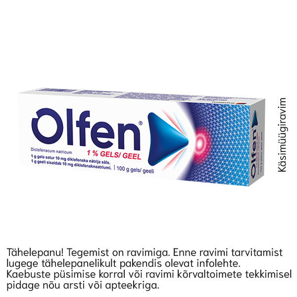 Olfen 1% geel 100 g Toimeaine: Diklofenaknaatrium. Käsimüügiravim: Nõrga kuni mõõduka valu ja põletiku paikne sümptomaatiline leevendamine pärast väikeste või keskmise suurusega liigeste ja liigeste piirkonna traumat. Olfen (diklofenak) 1%