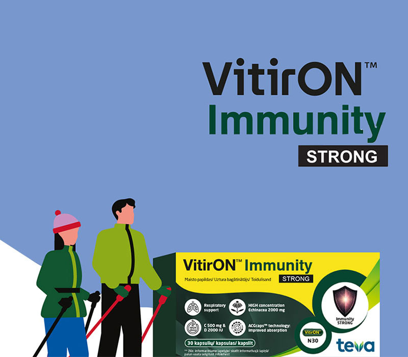 VitirON Immunity STRONG sisaldab vitamiine, mineraale ja taimeekstrakti, mida organism vajab immuunsüsteemi normaalseks toimimiseks ja hingamise toetamiseks. Tsink, seleen, vitamiinid C, D3, B6, B12, niatsiin, foolhape aitavad säilitada immuunsüsteemi normaalset talitlust. Punane päevakübar aitab säilitada normaalset ülemiste hingamisteede funktsiooni ning vähendada ärritust kurgus ja neelus.**